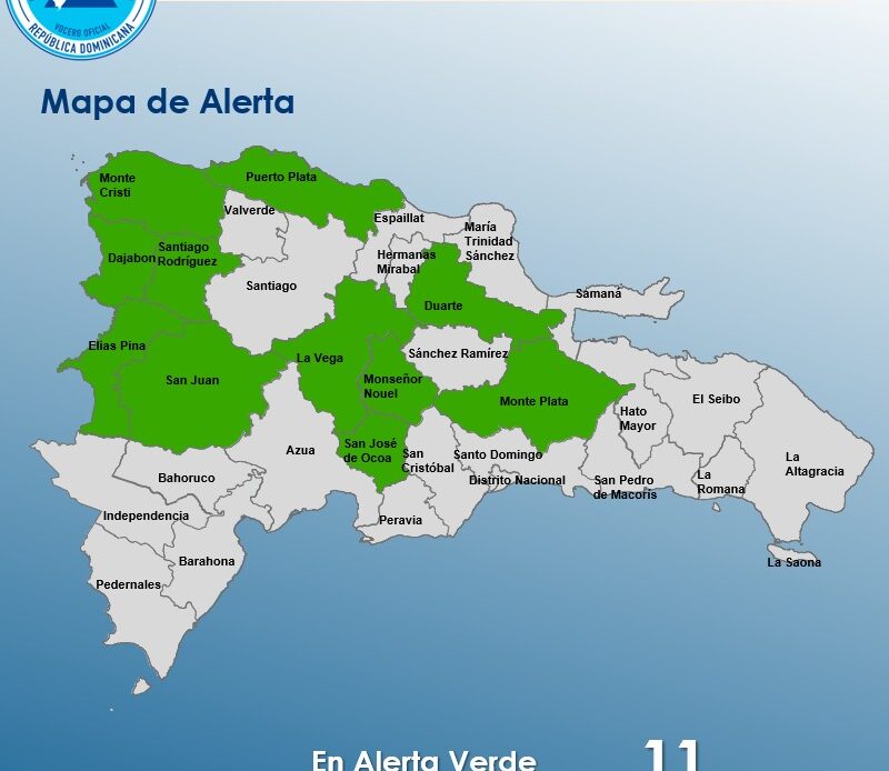 Entre las demarcaciones bajo alerta se encuentran Monte Plata, La Vega, Monseñor Nouel, San Juan, Elías Piña, Santiago Rodríguez, Puerto Plata, Montecristi, Dajabón, San José de Ocoa y Duarte, especialmente en la zona del Bajo Yuna.