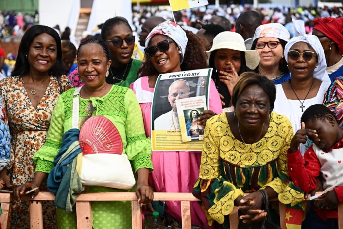 Los fieles esperan la llegada del Papa León XIV para la Santa Misa en el aeropuerto Yaounde-Ville en Yaundé, Camerún, 18 de abril de 2026.